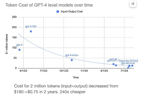 The same pattern of innovation has repeated itself. GPT 3 (Davinci) at $60/1M TOK in late 2021 -> GPT 3.5 Turbo (ChatGPT / GPT Instruct) at $2/1M TOK in MAY 2023 -> GPT 4.0 at $90/1M TOK -> GPT 4 Turbo -> GPT 4o and so on.