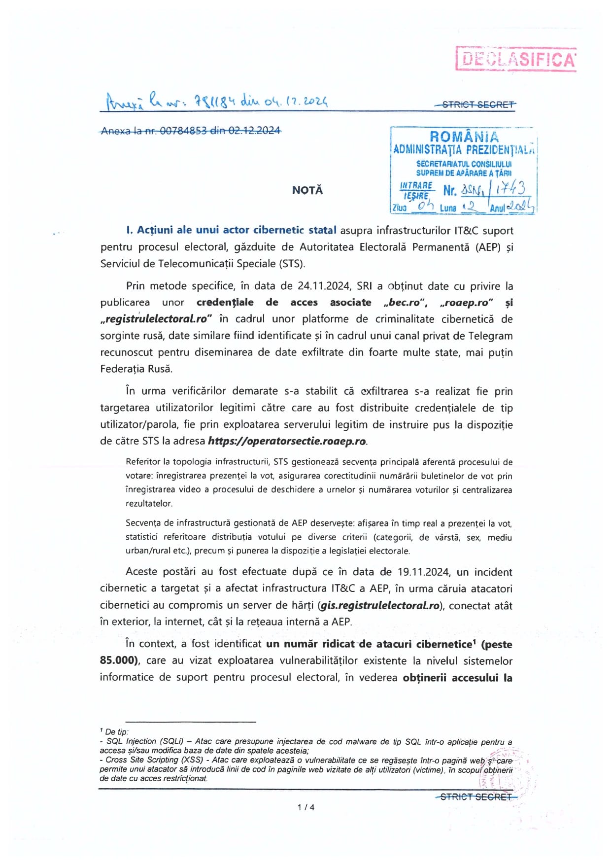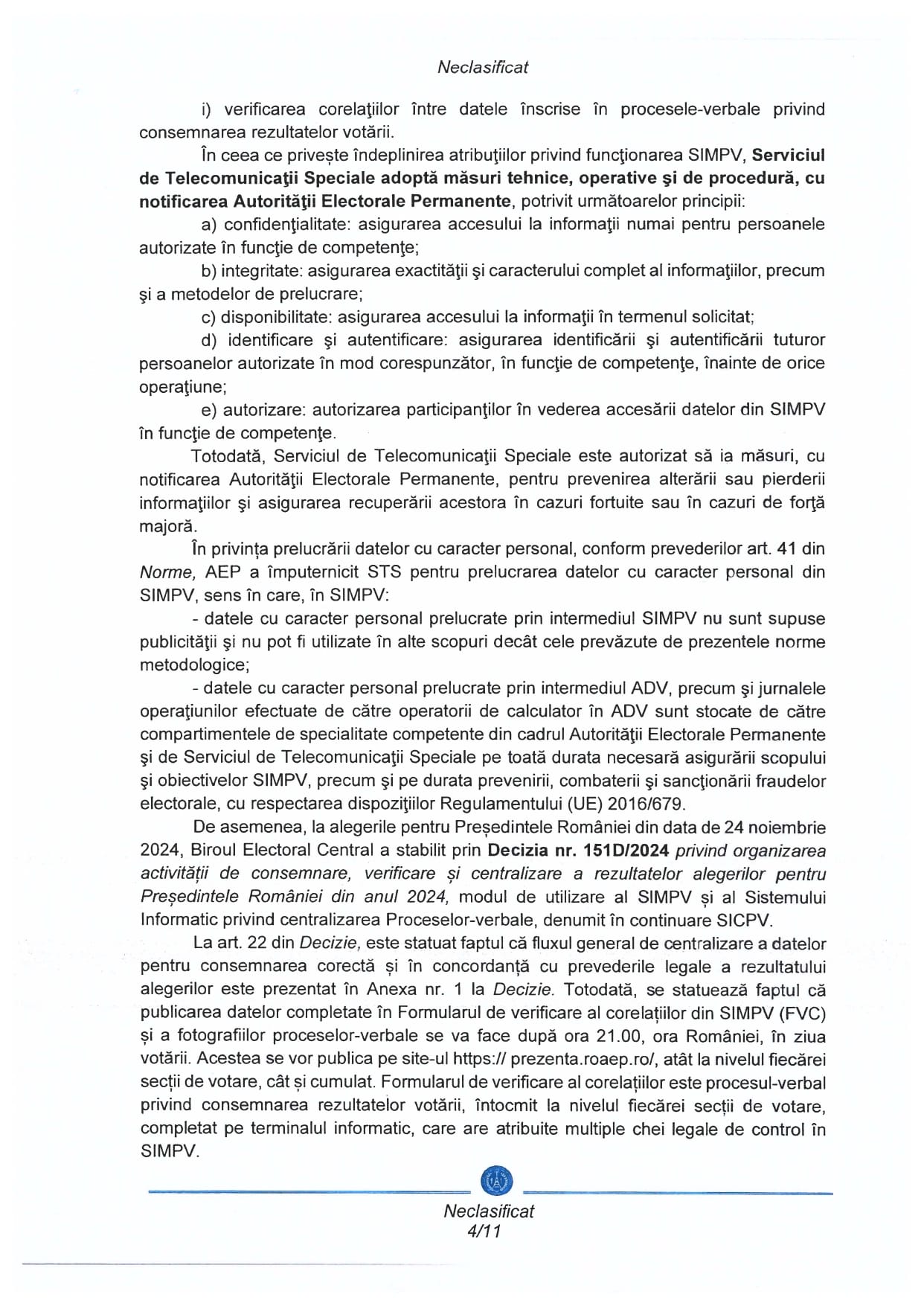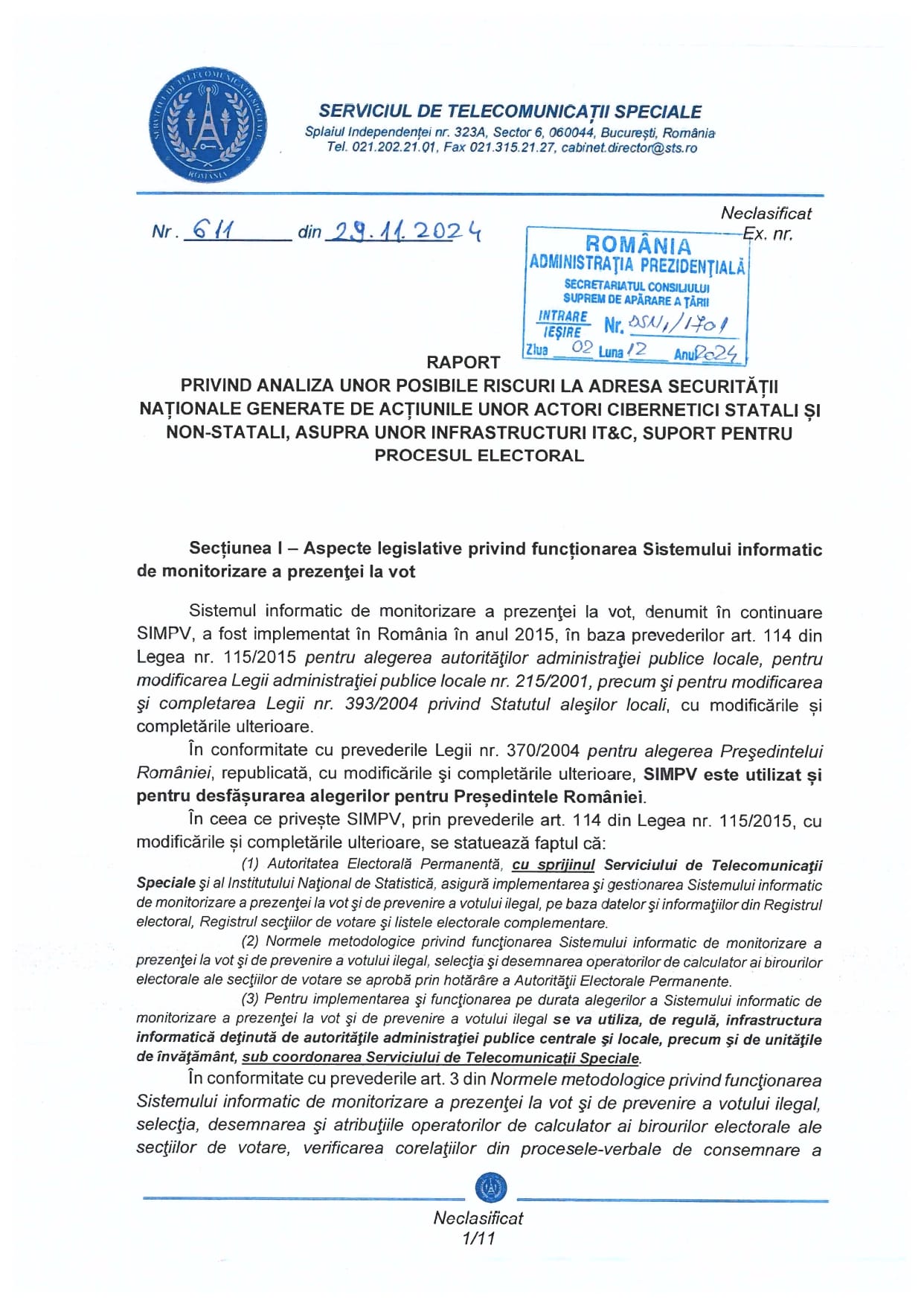 The decision was made in the context of serious allegations of electoral fraud and manipulation of the electoral process, brought to the Court's attention through declassified informational notes from the intelligence services (SRI, SIE, DGPI, STS).