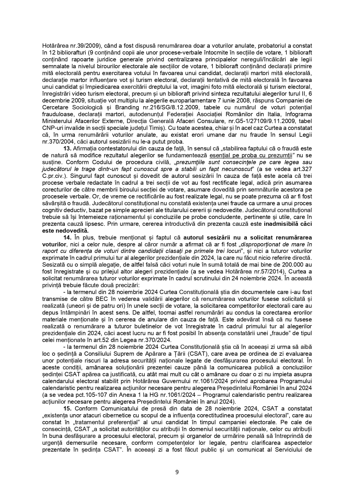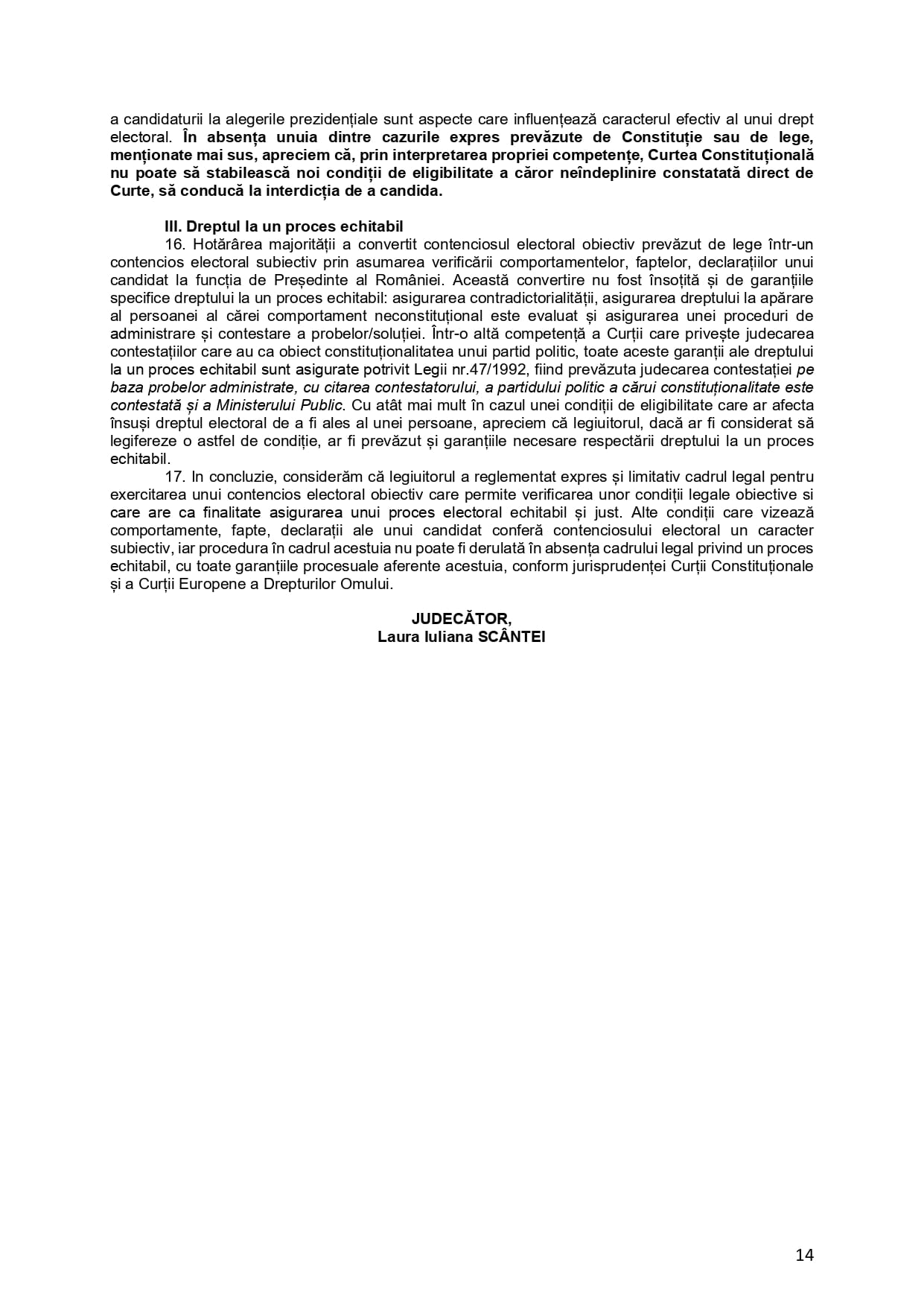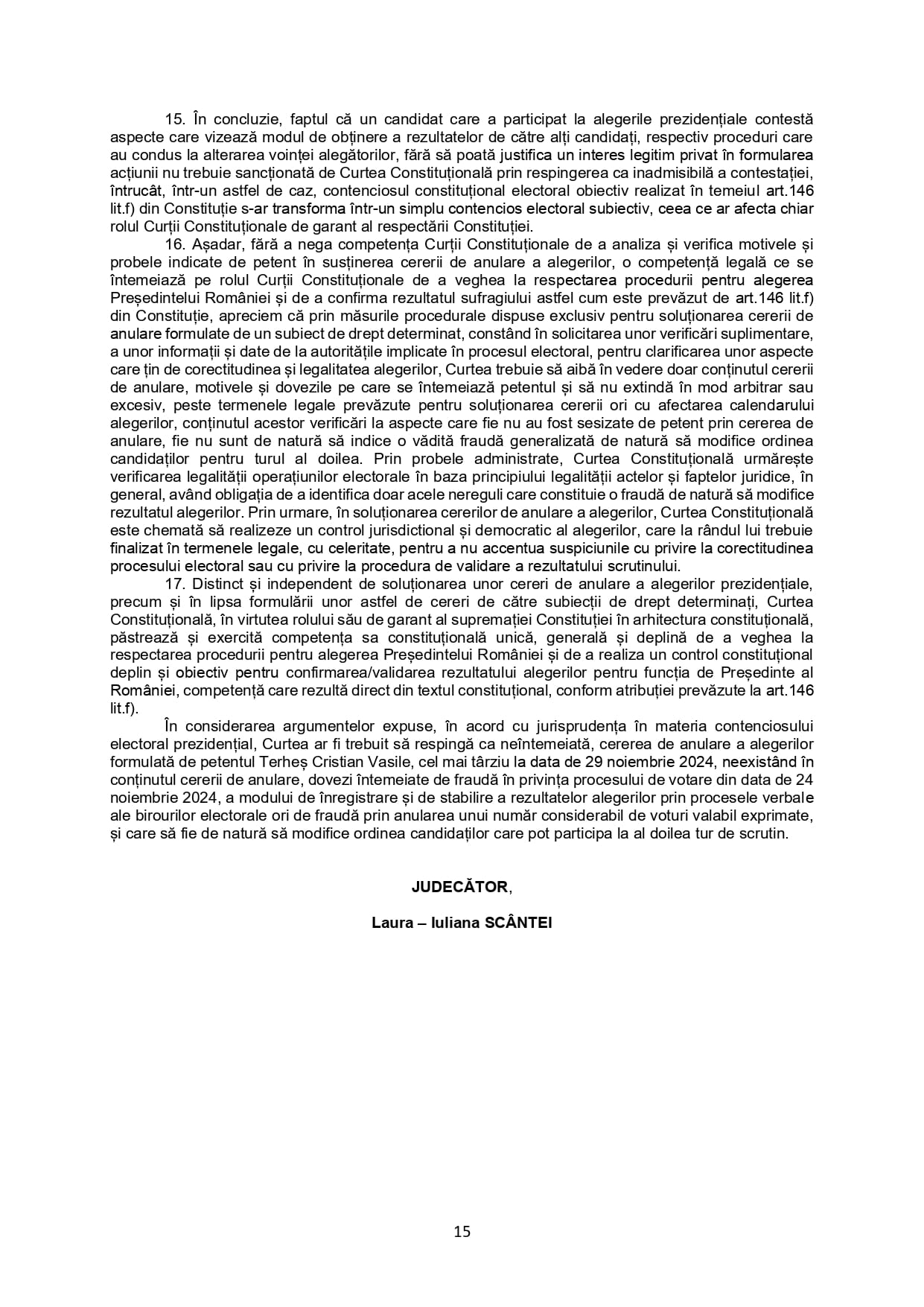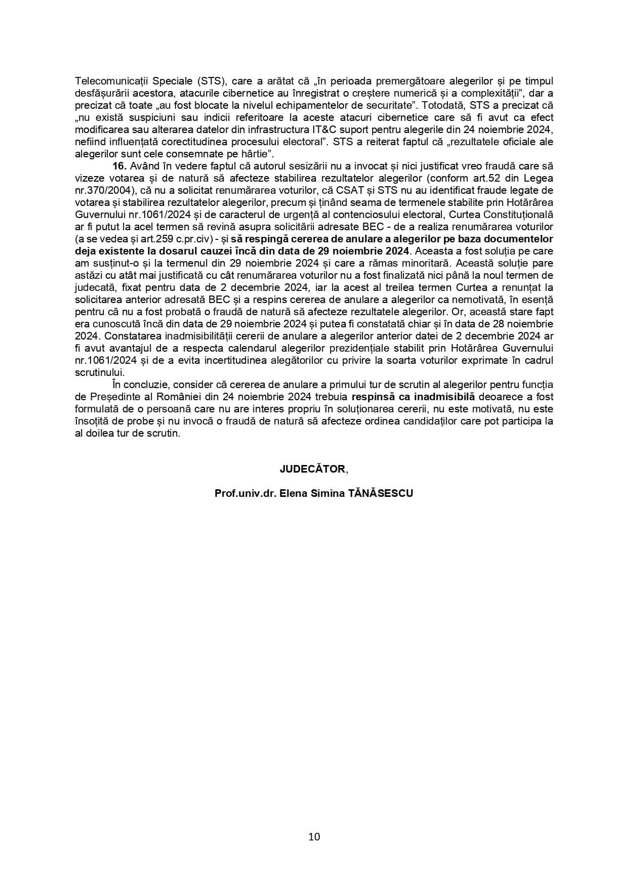 Judge Elena Simina Tănăsescu noted that the request should be dismissed as inadmissible, citing a lack of procedural interest, lack of motivation, and failure to prove fraud. Judge Laura-Iuliana Scântei believed that the request should be dismissed as unfounded without ordering a recount of the votes, a measure she deemed excessive and disproportionate.