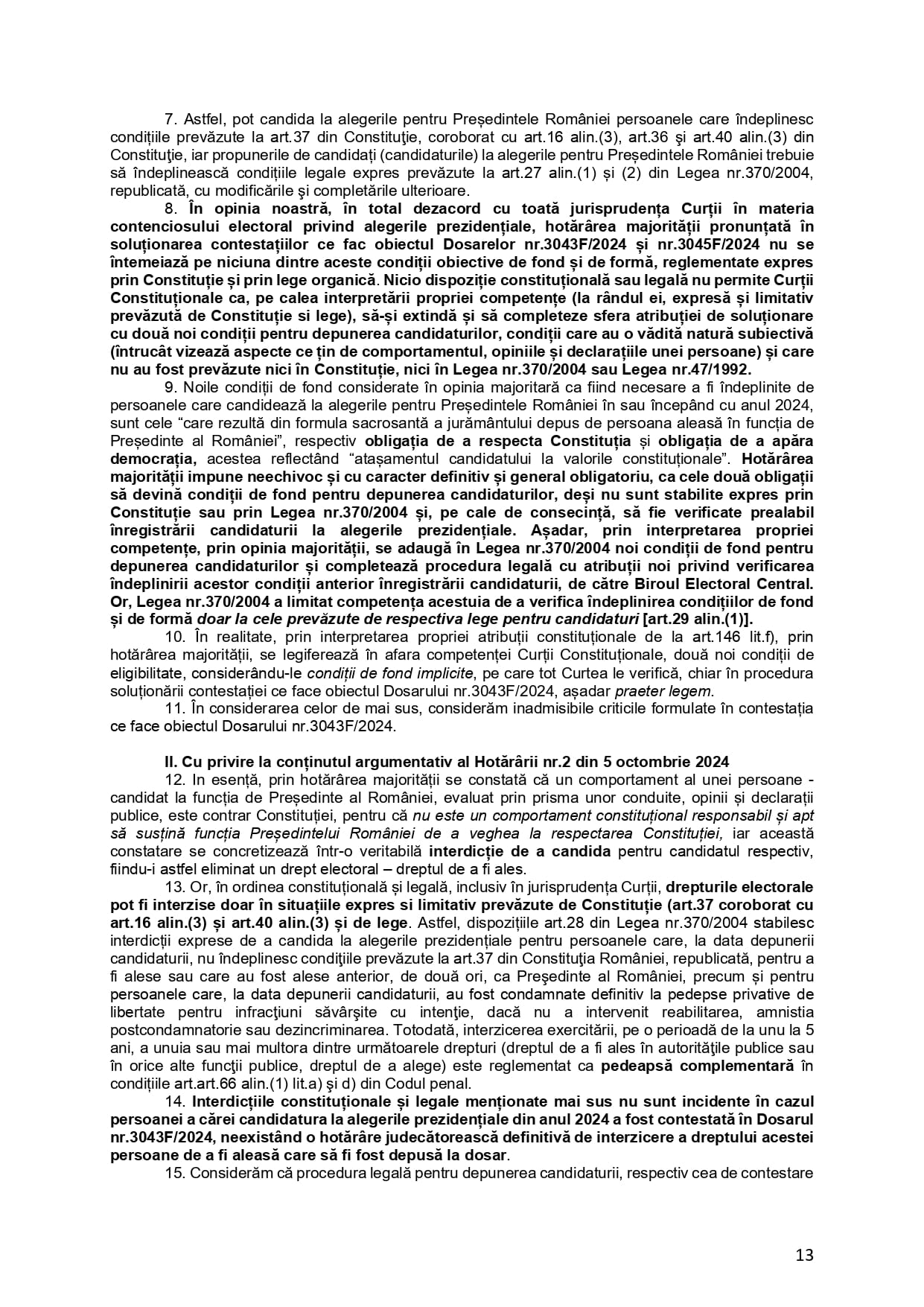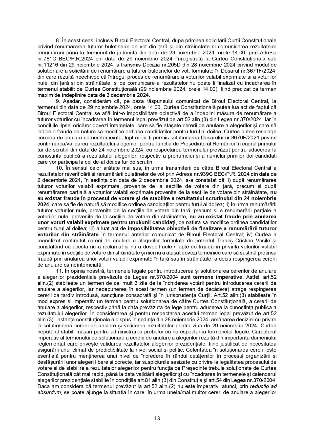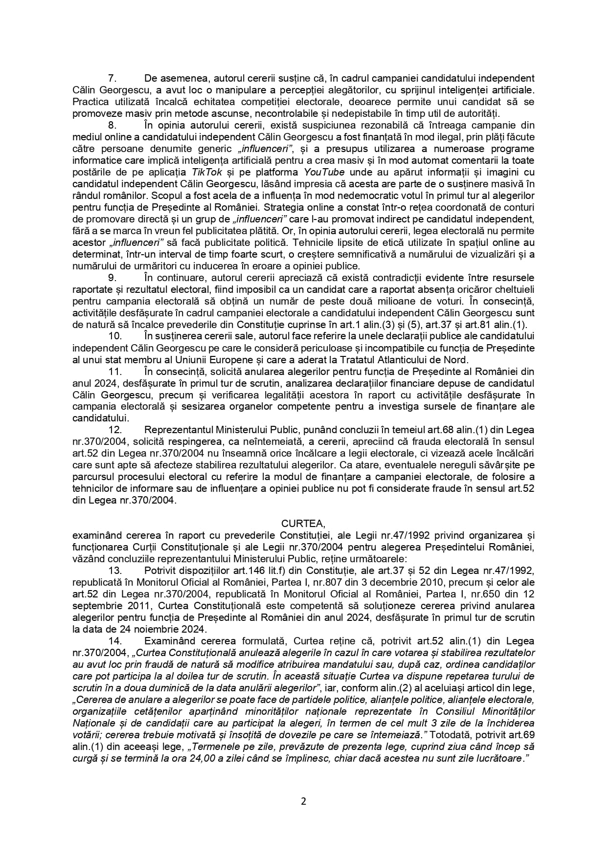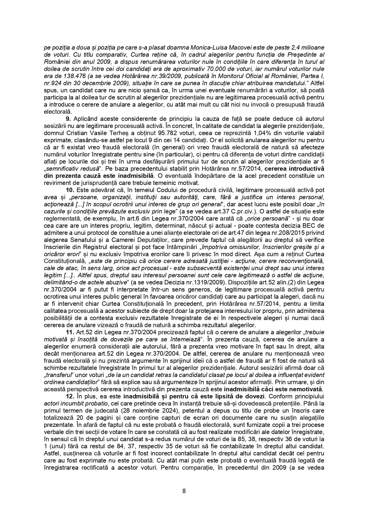 Judge Elena Simina Tănăsescu noted that the request should be dismissed as inadmissible, citing a lack of procedural interest, lack of motivation, and failure to prove fraud. Judge Laura-Iuliana Scântei believed that the request should be dismissed as unfounded without ordering a recount of the votes, a measure she deemed excessive and disproportionate.