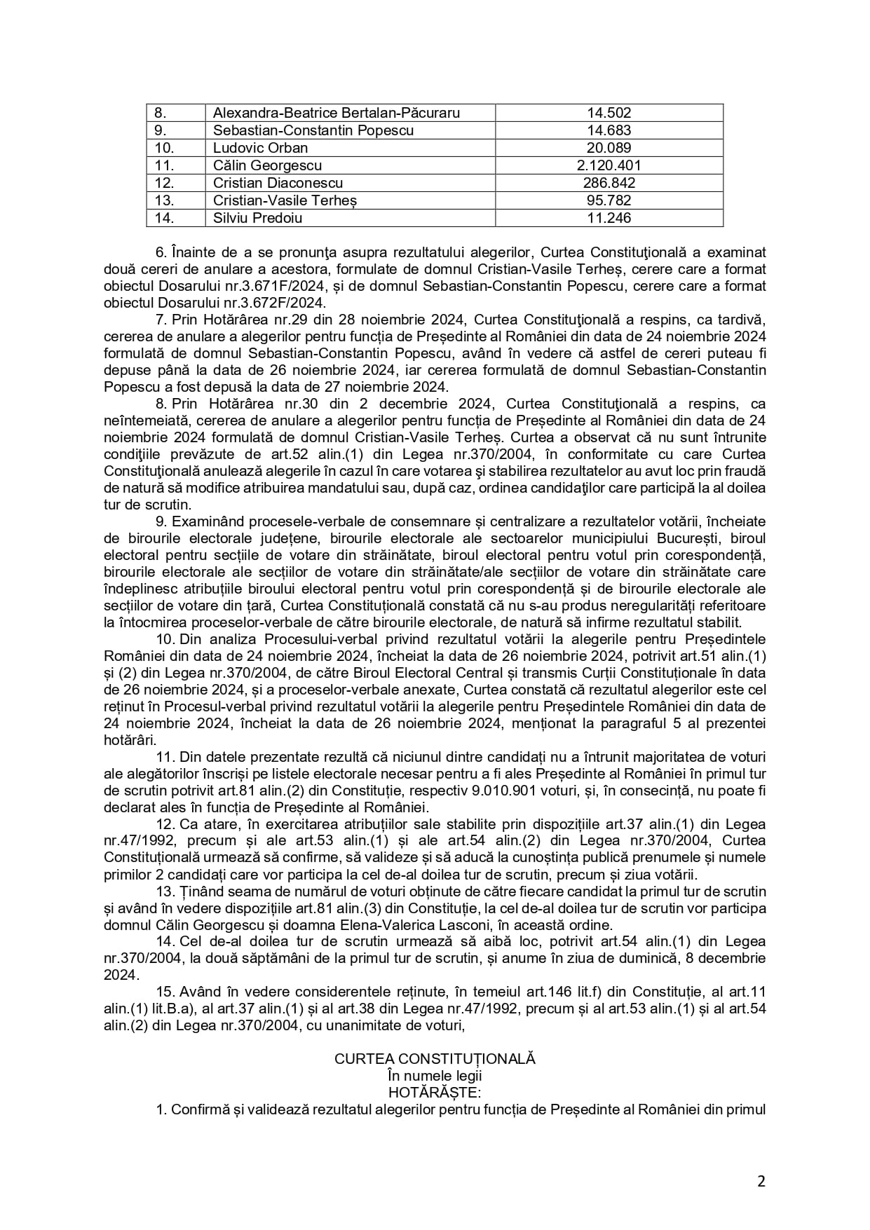 The court found that none of the candidates received the absolute majority required to be elected in the first round, specifically 9,010,901 votes. Consequently, applying constitutional and legal provisions, it established the necessity of organizing a second round of voting between the top two candidates. This is scheduled to take place on December 8, 2024, between Călin Georgescu and Elena-Valerica Lasconi, in that order.