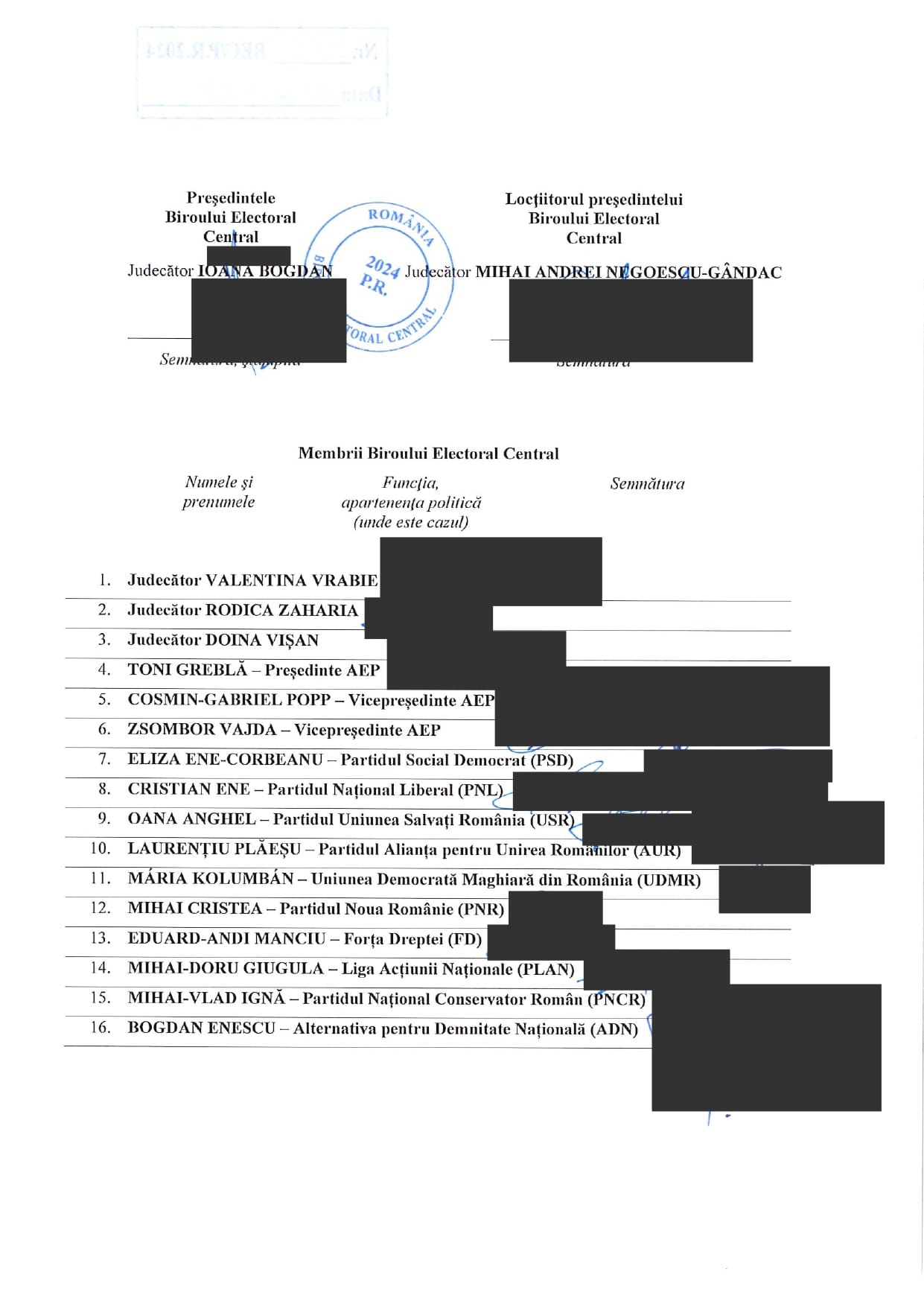 On November 26, BEC submitted to the Court the centralizing minutes along with all the minutes from the electoral offices. An examination of these documents revealed that out of the 18,021,800 registered voters on the permanent lists, 9,465,650 turned out to vote, with 9,242,186 valid votes and 223,132 null votes. Călin Georgescu received 2,120,401 votes, Elena-Valerica Lasconi 1,772,500 votes, and Ion-Marcel Ciolacu 1,769,760 votes.