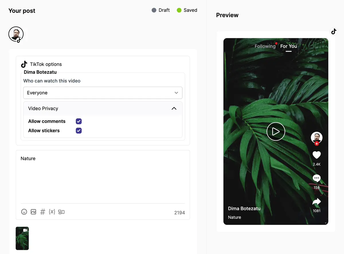 Our AI-powered system supports video content across popular platforms, including Facebook Reels, Instagram Reels, YouTube Shorts, and TikTok. By incorporating video into your social media strategy, you can effectively communicate your message and reach a wider audience in a visually engaging and attention-grabbing way.