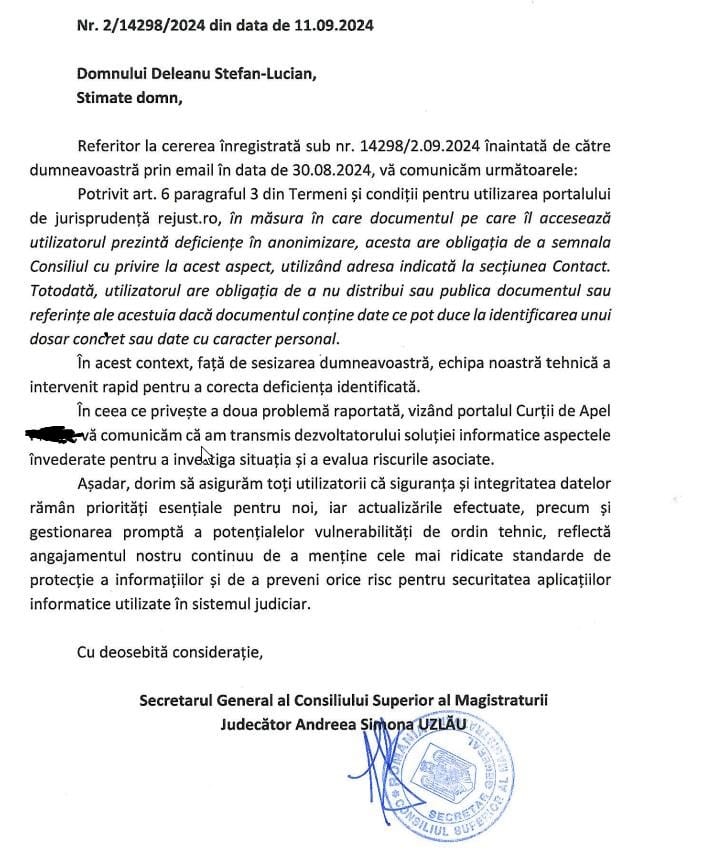 The Court of Appeal Constanta has requested that we communicate the vulnerable aspects to the authorities, stating once again that anonymization by name is sufficient to protect the case number.
