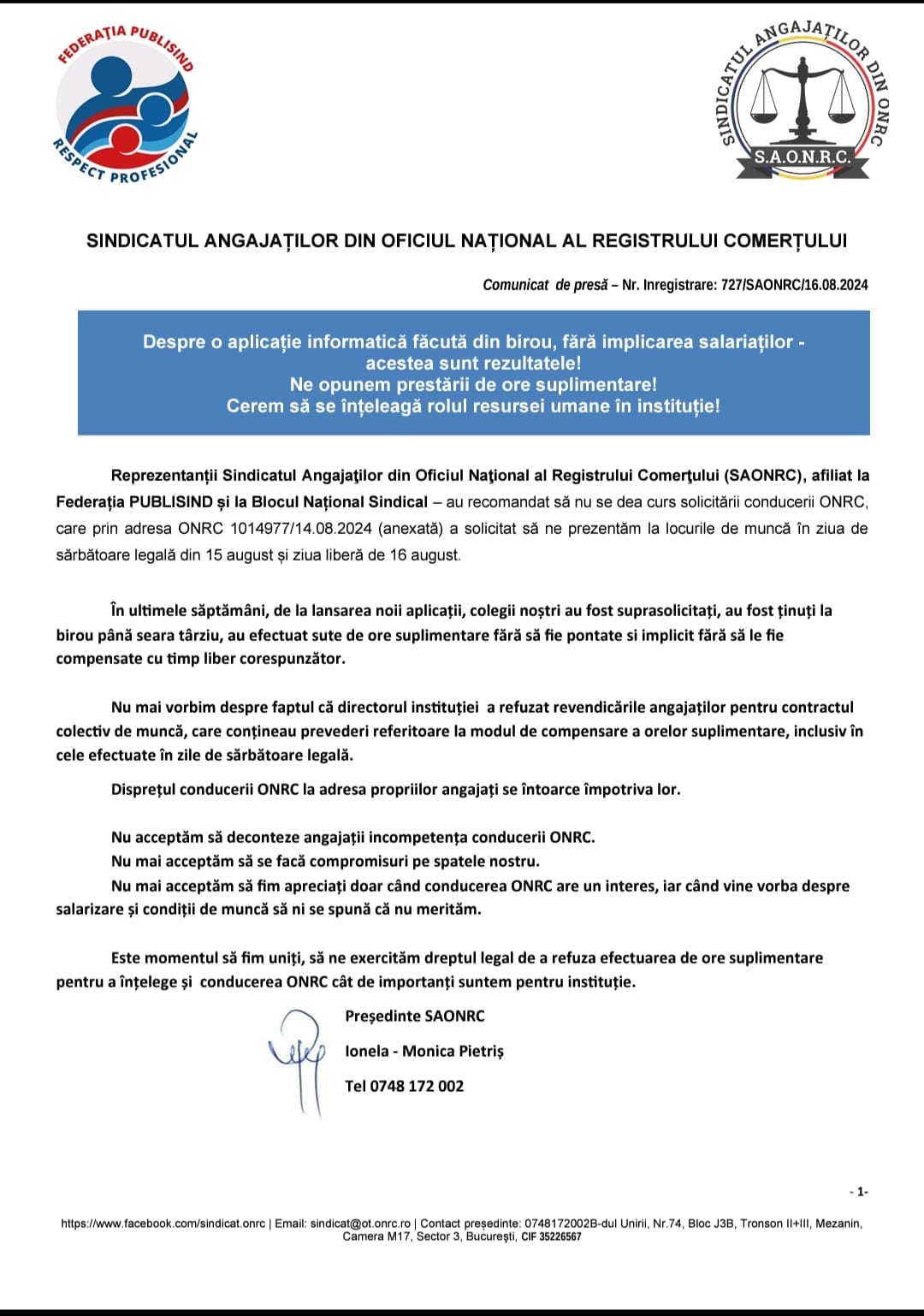 In the context of the suspension of the National Trade Register Office and the trade register offices attached to the courts for technical assistance work on the integrated IT system of the ONRC (July 19 โ 25, 2024), a significant volume of registration requests has been generated. These requests, combined with those existing before July 19, 2024, as well as the large number of requests currently being registered, require considerable effort to be resolved efficiently.